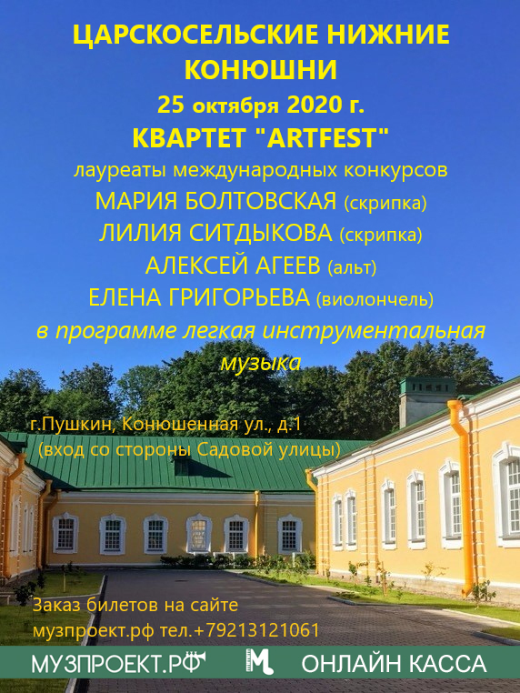 Поэтому приглашаем всех-всех 25 октября в 17 часов в новое, после долгих лет запустения и забвения, только что открывшееся арт-пространство «Царскосельские Нижние конюшни» на концерт петербургского квартета «ARTFEST».