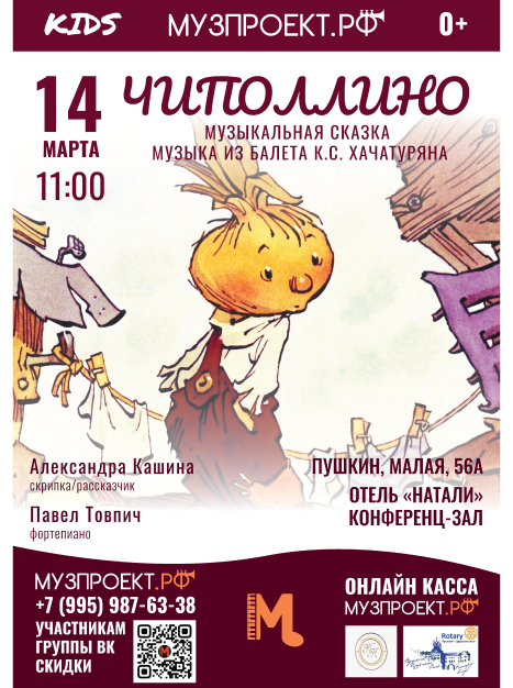 14 марта в 11:00 в Конференц-зале отеля Натали - "Чиполлино" Карена Хачатуряна в интерпретации для скрипки, фортепиано и рассказчика.