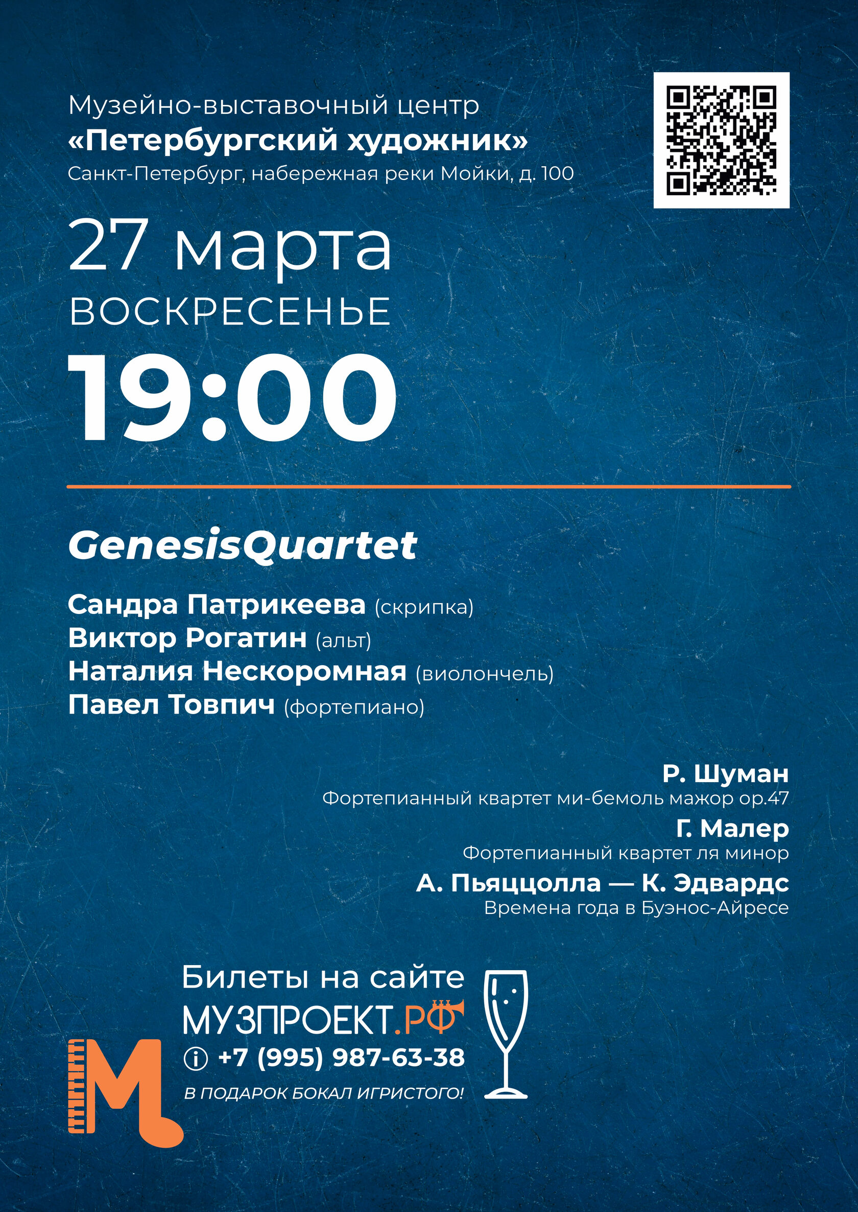 27 марта в 19:00 в Музейно-выставочном центре «Петербургский художник», GenesisQuartet представит яркую и обаятельную программу, в которой соединятся произведения великих композиторов – Фортепианный квартет ми-бемоль мажор ор. 47 Р.Шумана и Фортепианный квартет ля минор Г.Малера, а дополнит их - остроумная танго-сюита «Времена года в Буэнос-Айресе» Астора Пьяццоллы в авторской обработке Клинта Эвардса.