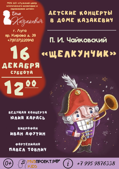 Концерт состоится 16 декабря (суббота) в 12.00 в зале Дома Казакевич по адресу: г. Луга, пр. Кирова д. 39.