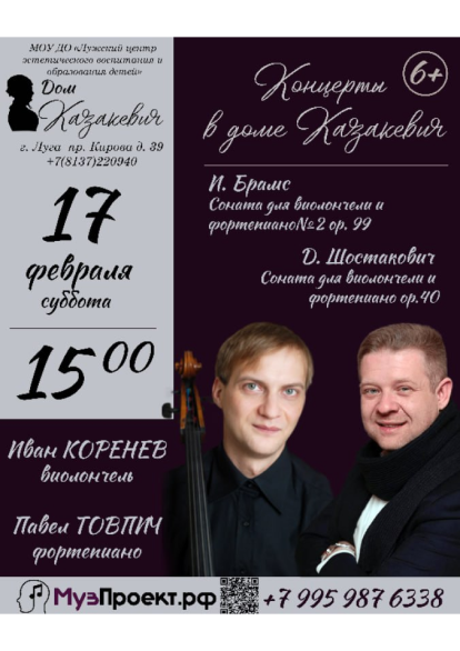 Для вас выступят лауреаты международных конкурсов Иван Коренев (виолончель) и Павел Товпич (фортепиано). В программу концерта вошли два великих произведения - Соната №2 для виолончели и фортепиано И. Брамса и Соната для виолончели и фортепиано Д. Шостаковича.