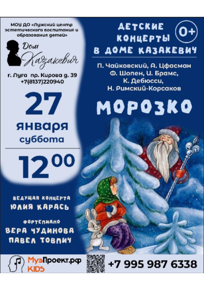 Концерт состоится 27 января (суббота) в 12.00 в зале Дома Казакевич по адресу: г. Луга, пр. Кирова д. 39.