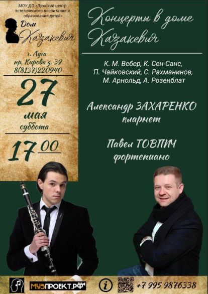 27 мая в 17:00 приглашаем вас на второй концерт цикла творческих встреч «Концерты в доме Казакевич», проводимых «Лужским центром эстетического воспитания и образования детей» совместно с творческим содружеством «Музпроект.РФ». Главным инструментом в концертной программе в этот раз станет кларнет.