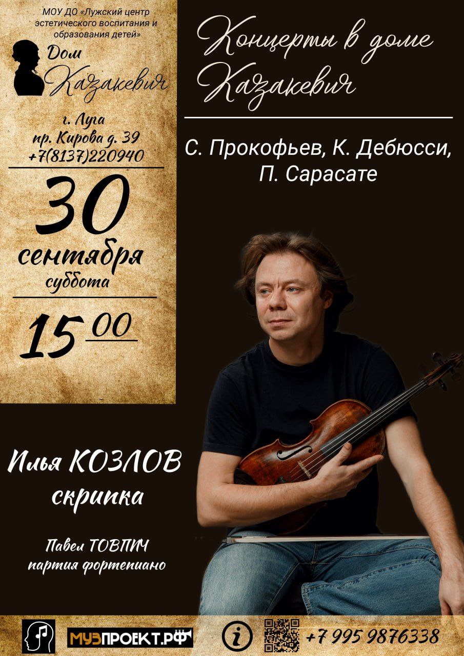 30 сентября в 15:00 «Лужский центр эстетического воспитания и образования детей» приглашает вас на первый в новом сезоне концерт из цикла творческих встреч «Концерты в доме Казакевич», проводимый совместно с творческим содружеством «Музпроект.рф». Для вас выступят талантливые петербургские музыканты: артист Заслуженного коллектива России, солист Санкт-Петербургской филармонии, стипендиат Ю.Темирканова - Илья Козлов (скрипка) и лауреат международных конкурсов, стипендиат Ю.Темирканова – Павел Товпич (фортепиано).