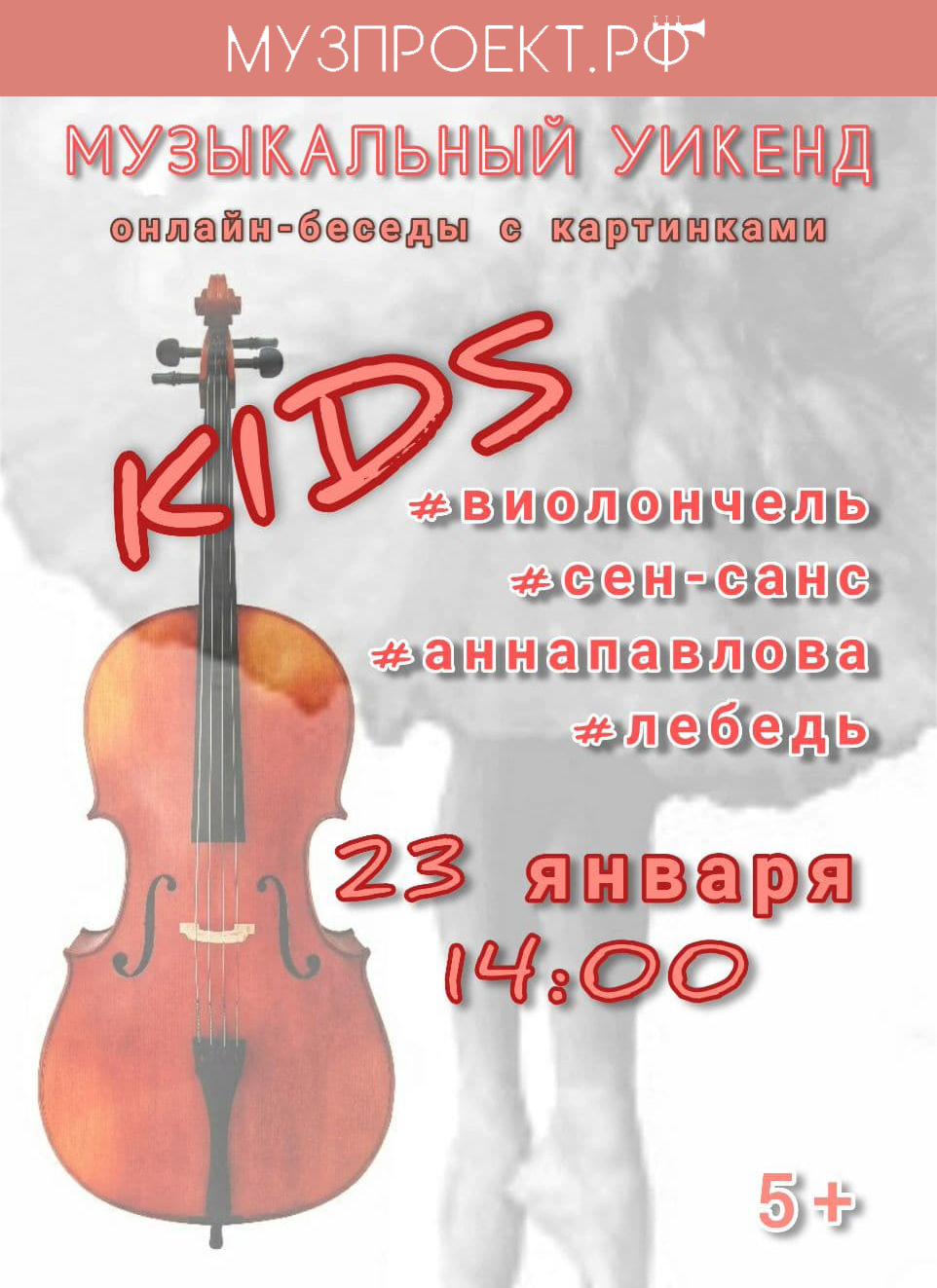 В субботу 23 января в 14:00 на занятии "Виолончель. Сен-Санс. Анна Павлова. Лебедь" поговорим о том, как устроена виолончель и зачем нужен смычок, что смешного в "Зоогической фантазии" Сен-Санса, кто прославил "Лебедя" на весь мир и почему однажды на концерте один великий виолончелист играл на виолончели в балетной пачке.